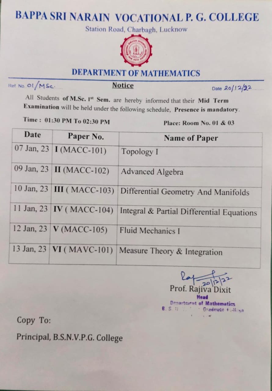 M.Sc.(Maths) Mid Sem. 1 Exams 2022 |