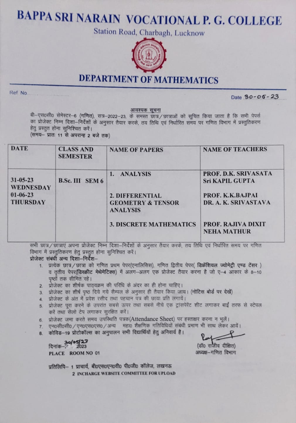 Amendment Notice Regarding Submission of Minor Project for B.Sc. (Mathematics) Sixth Semester 2023-2024, Major-1 |