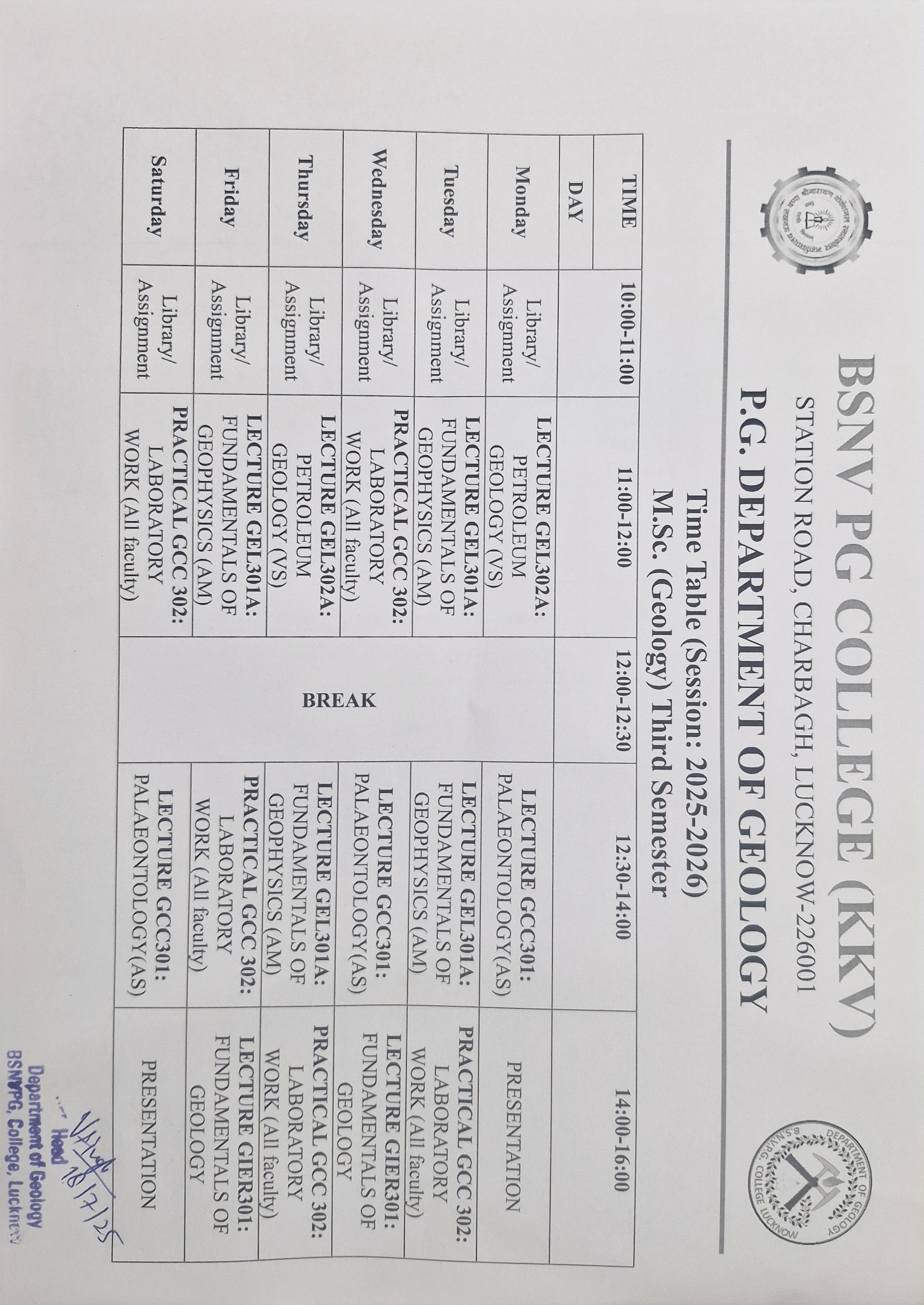 Time Table of M.Sc. Geology III Semester for session (2025-2026) |