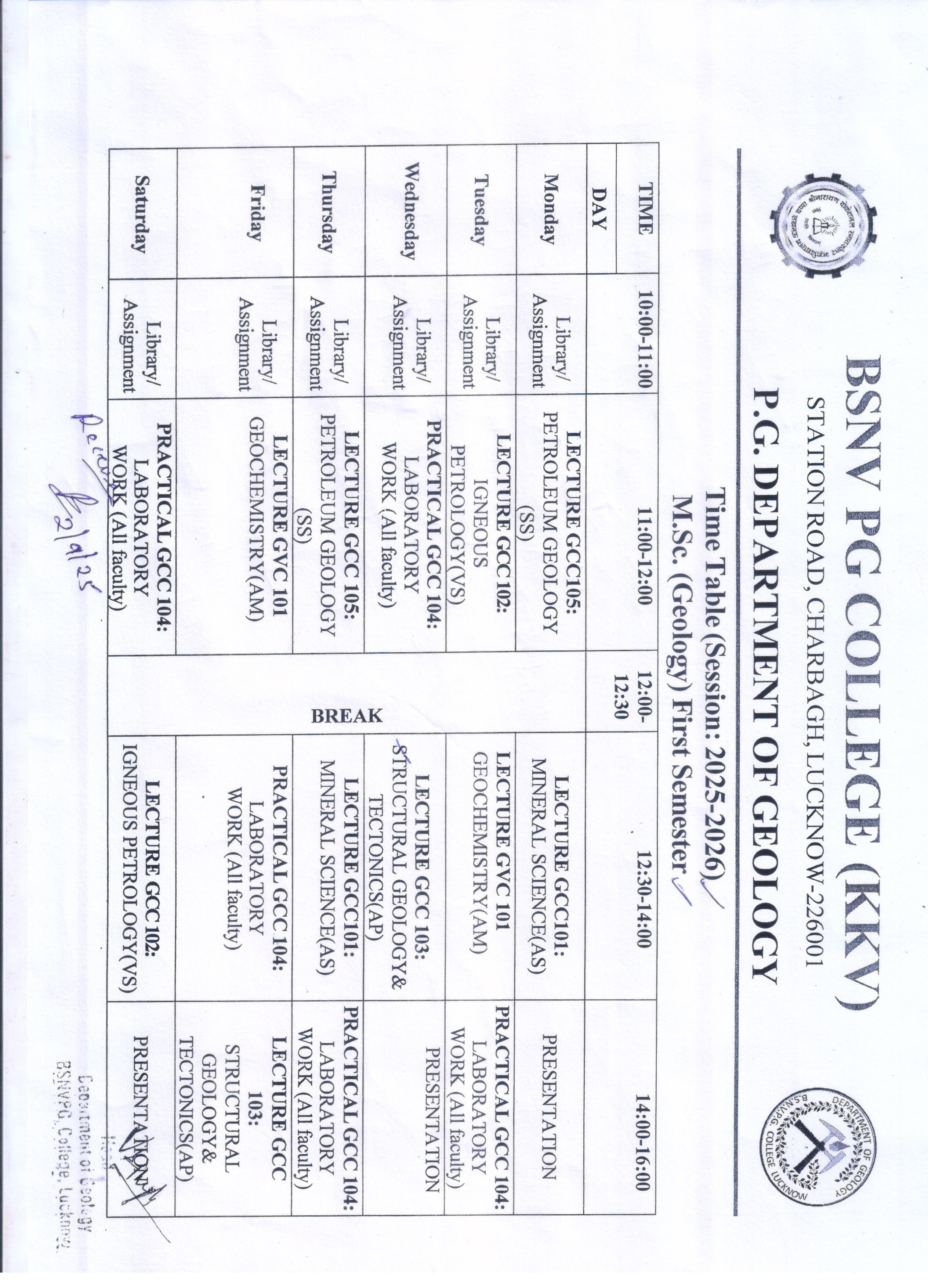 M.Sc. Geology I Semester Time Table for session (2025-2026) |